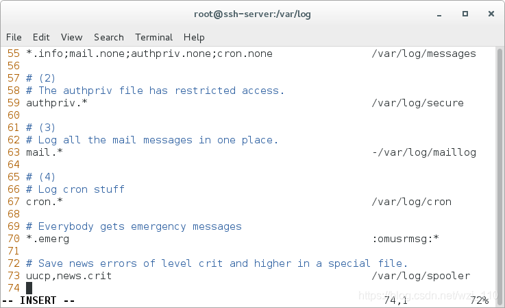 auth pam产生的日志authpriv ssh,ftp等登录信息的验证信息cron 时间计划任务相关kerl 内核lpr 打印mail 邮件mark(syslog) rsyslog服务内部信息,时间标识news 新闻组user 用户程序产生的相关信息uucp Unix主机之间相关的通信(了解)local 1-7 自定义的日志设备备注:uucp-->unix to unix copy